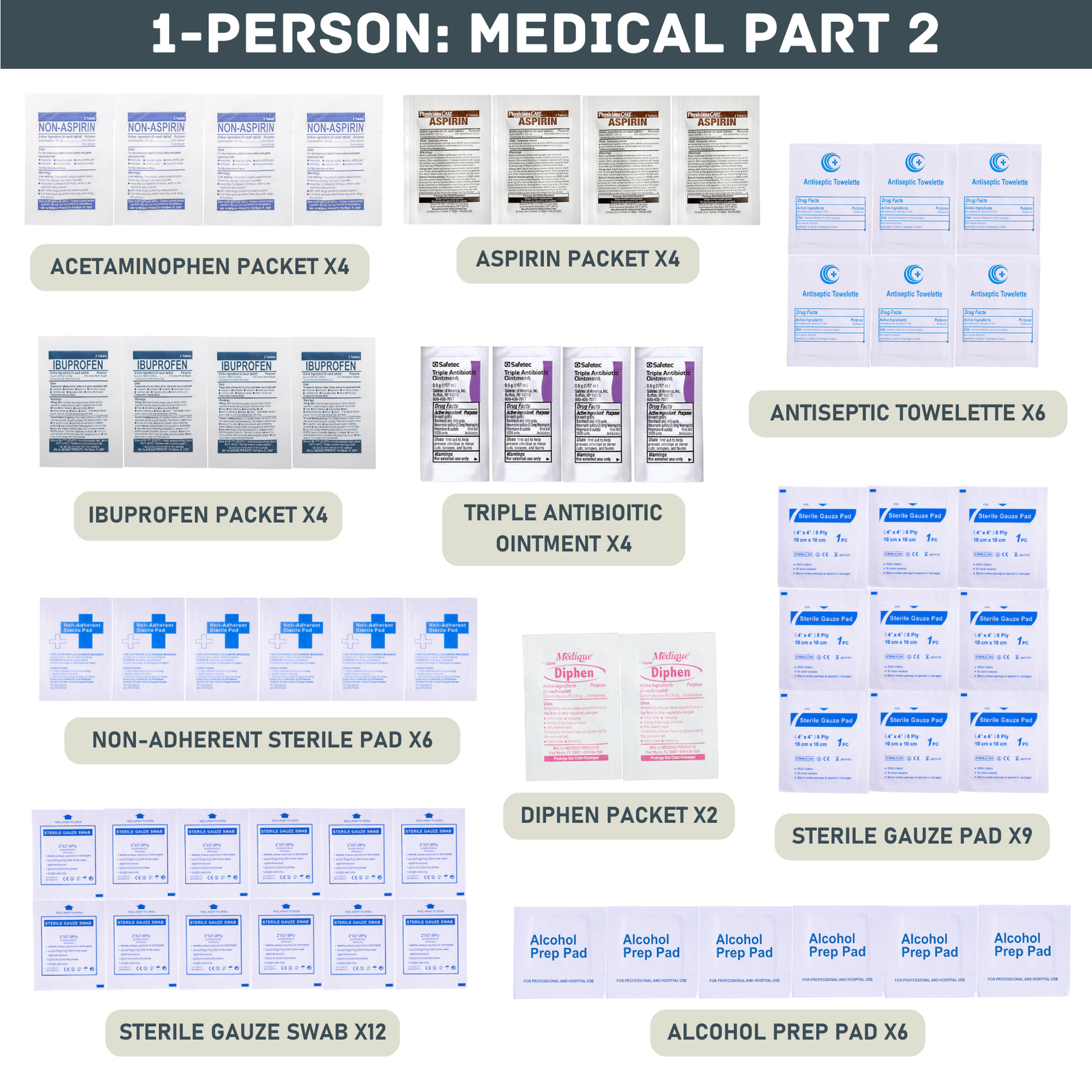 Note: These are not made to be separated out of a household or group of people that would use them together. For example, you will not have the needs supplied if you purchased a 4-Person Kit and tried to split it up between people living in different places.