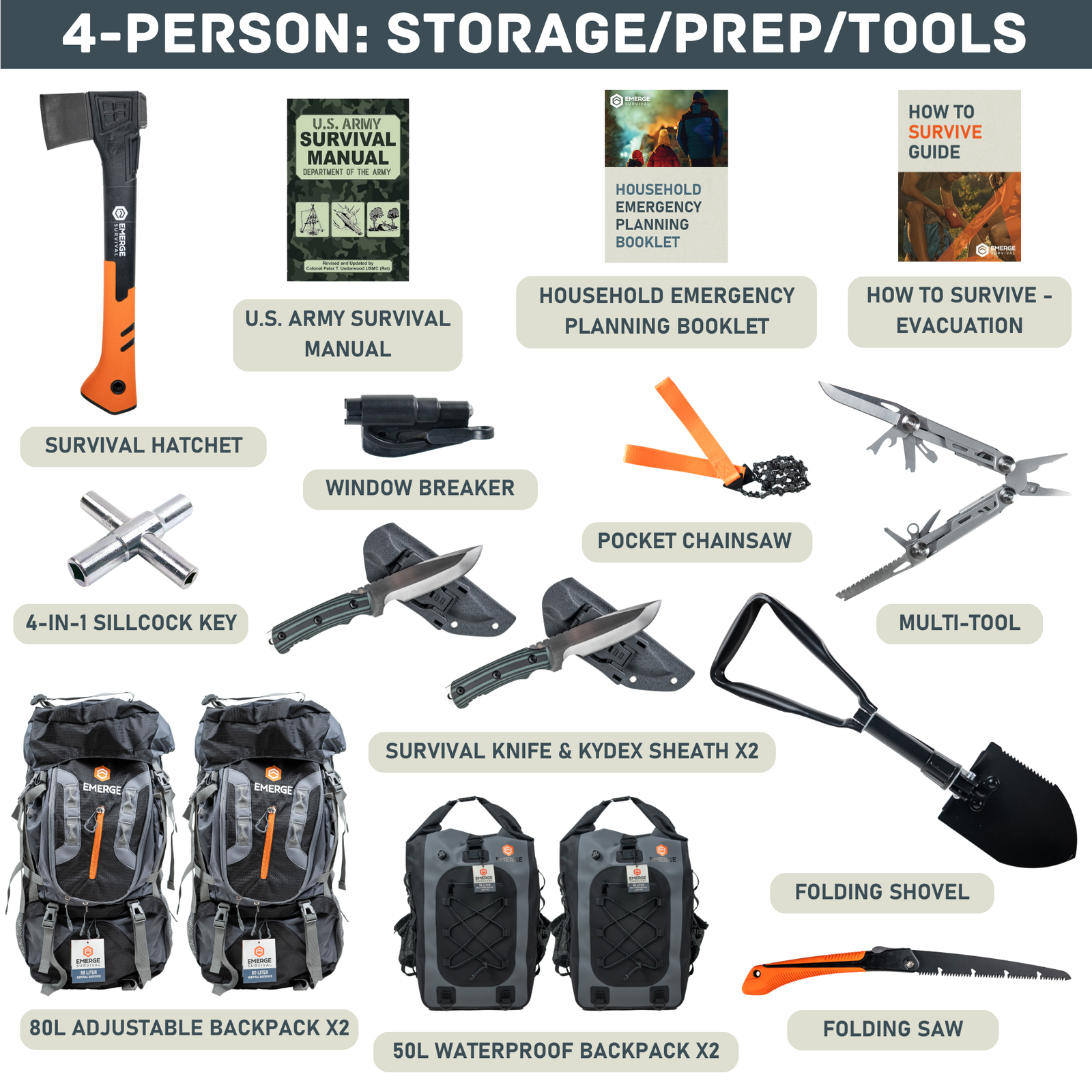Each size increases essential supplies like water filtration, shelter, medical gear, and survival tools, so every person is covered—no compromises.